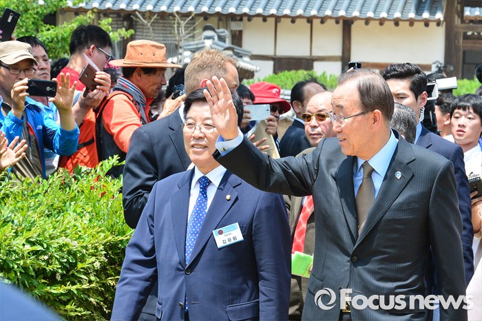 (안동=포커스뉴스) 반기문 유엔 사무총장이 29일 오후 경북 안동 하회마을 충효당을 방문해 시민들에게 인사하고 있다.