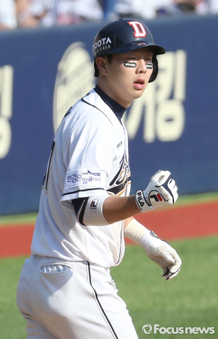 (서울=포커스뉴스) 29일 서울 잠실구장에서 열린 2016프로야구 LG-두산 경기 6회말 무사 1,2루에서 두산 박건우가 3루수 키를 넘기는 2타점 2루타와 송구 실책으로 3루에서 세이프된후 주먹을 쥐며 기뻐하고 있다.