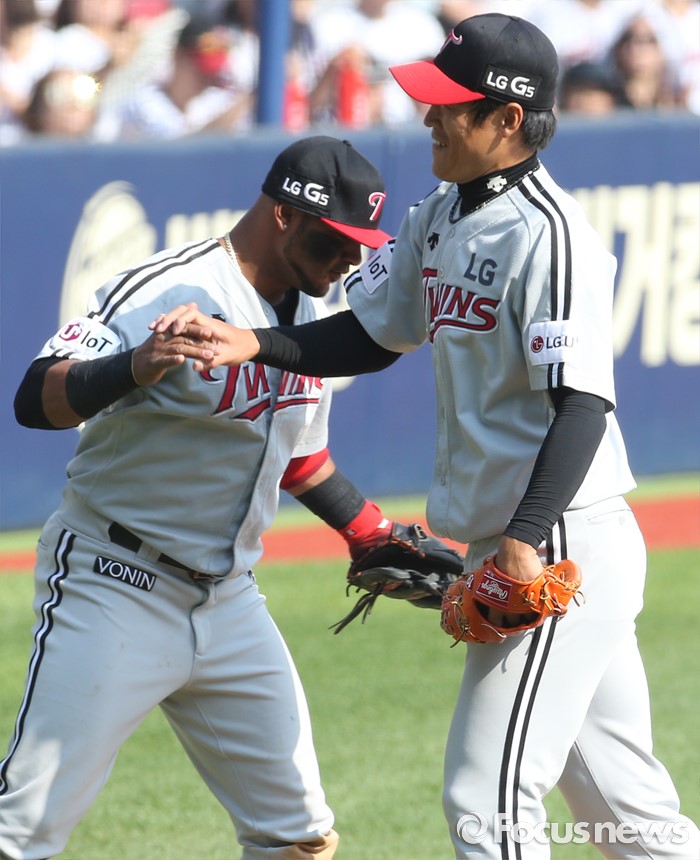 (서울=포커스뉴스) 29일 서울 잠실구장에서 열린 2016프로야구 LG-두산 경기에서 5회말 병살로 실점 위기를 넘긴 LG 투수 정현욱과 히메네스가 손을 맞잡고 있다.