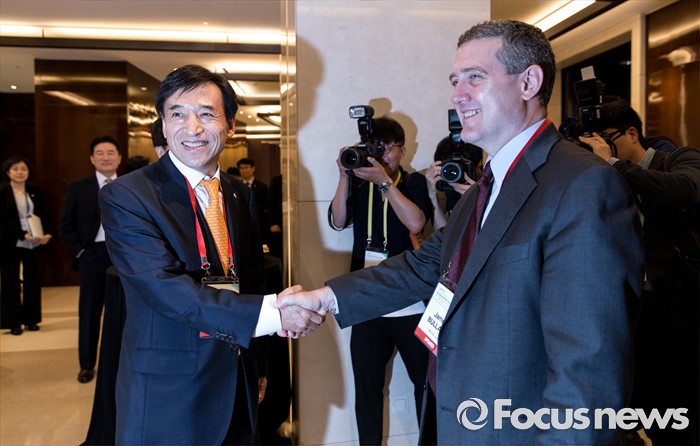 (서울=포커스뉴스) 30일 오전 서울 중구 웨스틴조선호텔에서 열린 2016 한국은행 국제컨퍼런스에서 이주열(왼쪽) 한국은행 총재가 제임스 불라드 세인트루이스 연은 총재와 악수를 하고 있다.
