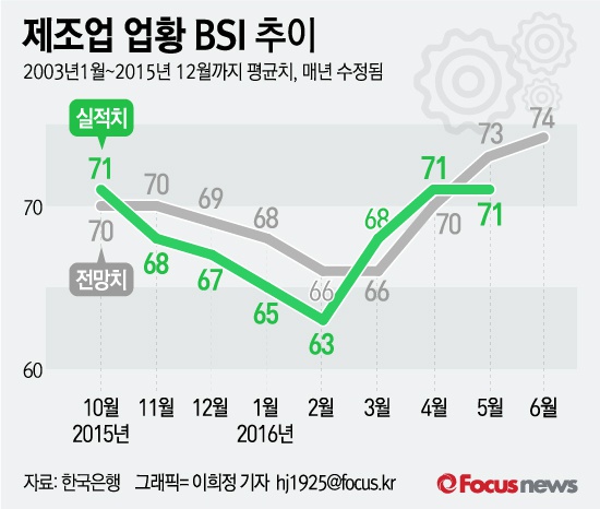 (서울=포커스뉴스) 30일 한국은행이 발표한 ‘2016년 5월 기업경기실가지수(BSI) 및 경제심리지수(ESI)’에 따르면 제조업의 5월 업황BSI는 71로 4월과 같았다.