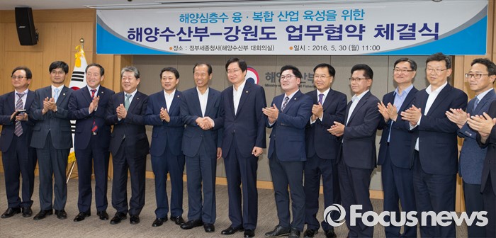 (세종=포커스뉴스) 30일 오전 세종시 정부세종청사 해양수산부 대회의실에서 열린 해양심층수 융·복합 산업 육성을 위한 해양수산부와 강원도 간 업무협약 체결식에서 김영석(왼쪽 일곱번째)) 해양수산부 장관과 최문순(왼쪽 여섯번째) 강원지사가 협약서를 들고 기념촬영 하고 있다.