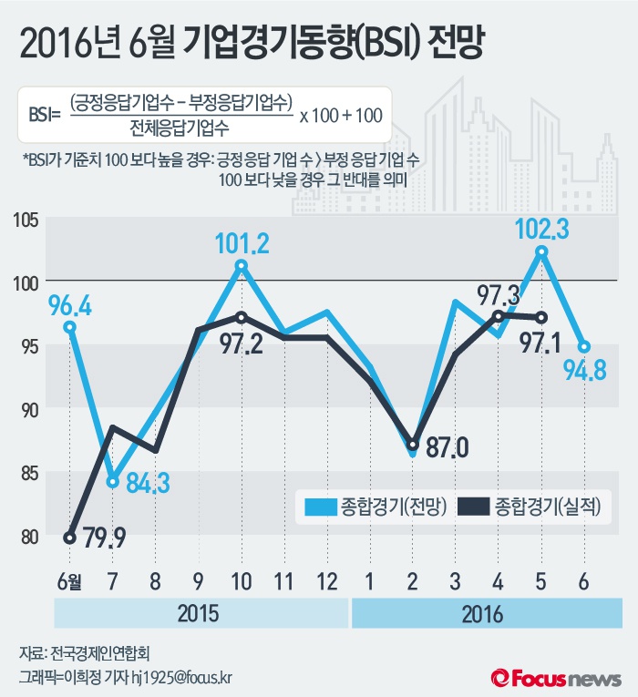 (서울=포커스뉴스) 30일 전경련이 매출액 기준 600대 기업을 대상으로 실시한 기업경기실사지수(BSI) 조사 결과, 6월 전망치는 94.8을 기록, 지난 5월(102.3)에 기준선 100을 상회한 뒤 한 달 만에 다시 부정적으로 전망됐다.