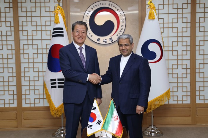 (서울=포커스뉴스) 임환수 국세청장이 30일 서울에서 세예드 카멜 타가비 네자드 이란 국세청장을 접견, 악수를 하고 있다. <사진제공=국세청>