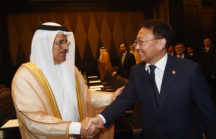 (서울=포커스뉴스) 유일호 부총리 겸 기획재정부 장관이 30일(현지시간) UAE 아부다비 St.REGIS호텔에서 열린 '제5차 한-UAE 경제공동위'에 참석, 회의시작에 앞서 수석대표인 알 만수리 경제부 장관과 악수하며 인사를 나누고 있다. <사진제공=기획재정부>