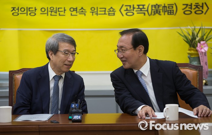 (서울=포커스뉴스) 노회찬 정의당 원내대표(오른쪽)가 31일 오전 국회에서 열린 정운찬 동반성장연구소 이사장 초청 특별강연에서 정 이사장과 대화 하고 있다. 이날 강연은 정의당의 '성역없이 듣겠습니다'란 이름의 의원단 연속 워크숍 '광폭 경청'의 일환으로 열렸으며 정 이사장은 '제20대 국회와 경제민주화'를 주제로 강연했다.