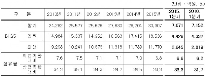 31일 국민건강보험공단(이사장 성상철)과 건강보험심사평가원(원장 손명세)이 2016년 1분기 진료비를 분석·발표한 ‘건강보험 주요통계’와 ‘진료비 통계지표’에 따르면 빅5 병원의 1분기 총 진료비는 7152억원으로 전년 동기 대비 1.1% 증가했다.