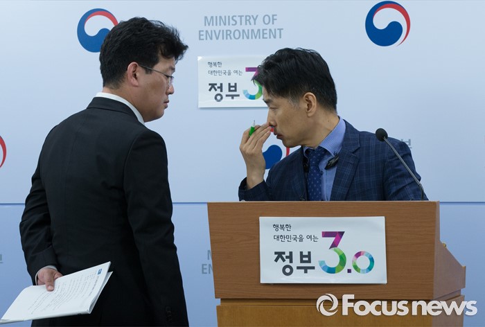 (세종=포커스뉴스) 서흥원(오른쪽) 환경부 환경보건정책과장이 31일 오전 세종시 정부세종청사 환경부 기자실에서 가습기살균제 피해 지원 지자체와 함께 한다는 브리핑중에 논의하고 있다.