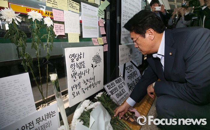 (서울=포커스뉴스) 정진석 새누리당 원내대표가 31일 오후 서울 광진구 지하철 구의역에서 스크린도어 정비 작업 중 사고로 숨진 김모(19) 씨의 사건장소를 방문해 고인을 추모하고 있다.
