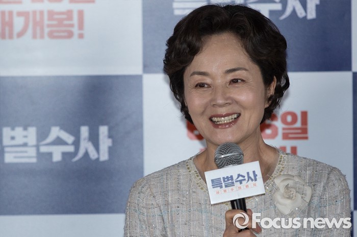 (서울=포커스뉴스) 31일 오후 서울 성동구 왕십리 CGV에서 열린 영화 ' 특별수사 : 사형수의 편지' 언론시사회에 참석한 배우 김영애가 취재진의 질문에 답하고 있다.