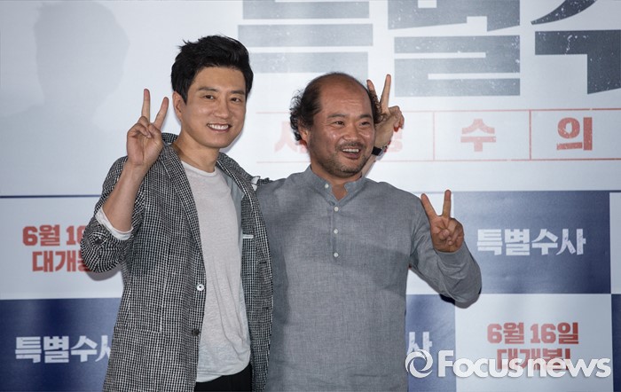 (서울=포커스뉴스) 31일 오후 서울 성동구 왕십리 CGV에서 열린 영화 ' 특별수사 : 사형수의 편지' 언론시사회에 참석한 배우 김명민(왼쪽)과 김상호가 포토타임을 갖고 있다.