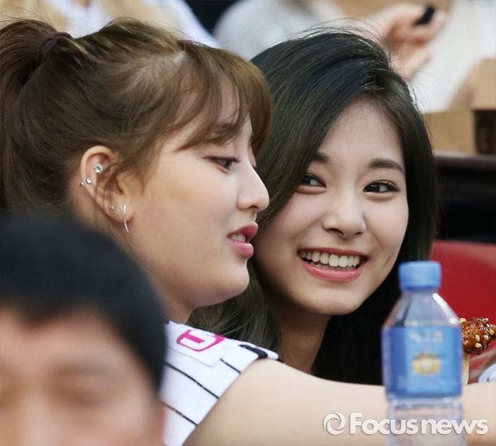 (서울=포커스뉴스) 31일 서울 잠실구장에서 열린 2016 프로야구 KIA-LG 경기에서 인기 걸그룹 트와이스의 쯔위(오른쪽)와 지효가 중앙 관중석에서 경기를 즐기고 있다.
