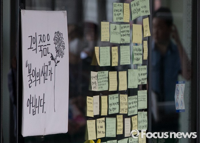 앞서 지난 28일 오후 5시57분 외주업체 직원이었던 김군은 구의역 승강장에서 안전문을 수리 하다 전동차에 치여 숨졌다.31일 오전 서울 광진구 지하철 2호선 구의역 스크린도어 사고 현장에 시민들의 추모 쪽지가 붙어 있다. 2016.05.31 양지웅 기자