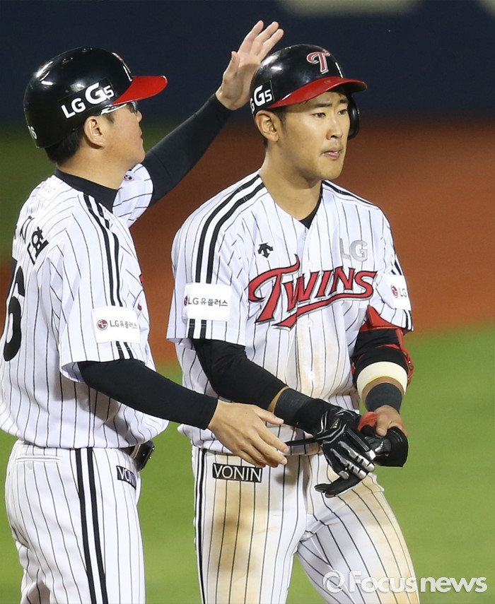 (서울=포커스뉴스) 31일 서울 잠실구장에서 열린 2016 프로야구 KIA-LG 경기 4회말 2사 만루에서 LG 정주현의 주자일소 3루타를 치고 유지현 코치의 축하를 받고 있다.