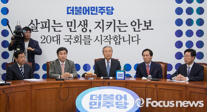 (서울=포커스뉴스) 김종인(가운데) 더불어민주당 비상대책위원회 대표가 1일 오전 서울 여의도 국회에서 열린 비상대책위원회의에서 모두 발언을 하고 있다. 왼쪽부터 진영 비대위원, 이종걸 전 원내대표, 김 대표, 우상호 원내대표, 양승조 비대위원