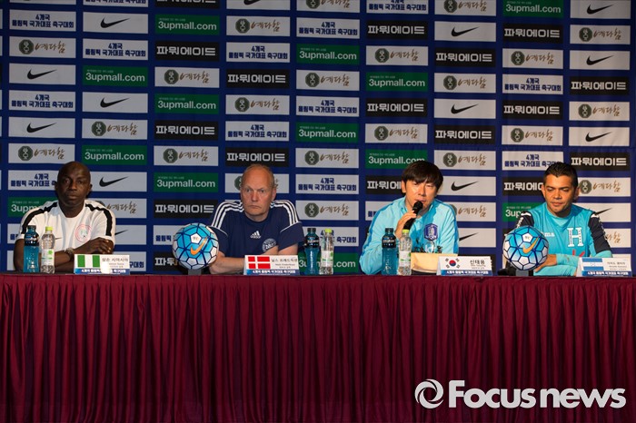 (인천=포커스뉴스) 1일 오전 인천 연수구 라마다송도호텔에서 열린 4개국 올림픽 국가대표 축구대회 공식 기자회견에서 참가국 감독과 수석코치가 취재진 질문에 답하고 있다. 왼쪽부터 삼손 시아시아 나이지리아 감독, 닐스 프레드닉센 덴마크 감독, 신태용 대한민국 감독, 아마도 궤바라 온두라스 수석코치.