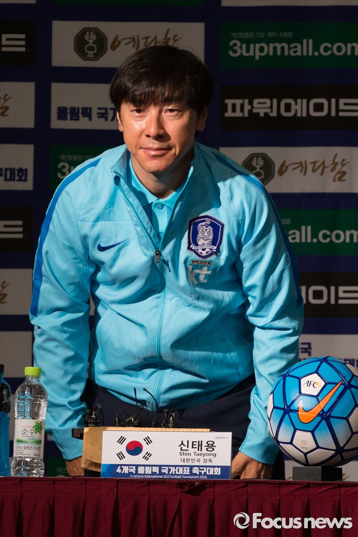 (인천=포커스뉴스) 1일 오전 인천 연수구 라마다송도호텔에서 열린 4개국 올림픽 국가대표 축구대회 공식 기자회견에 참가한 신태용 대한민국 감독이 인사를 하고 있다.