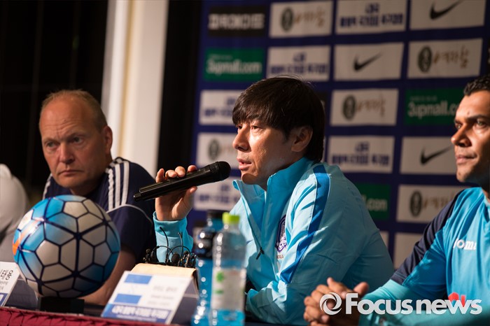 (인천=포커스뉴스) 1일 오전 인천 연수구 라마다송도호텔에서 열린 4개국 올림픽 국가대표 축구대회 공식 기자회견에서 신태용 대한민국 감독이 질문에 답하고 있다. 왼쪽부터 닐스 프레드닉센 덴마크 감독, 신 감독, 아마도 궤바라 온두라스 수석코치.