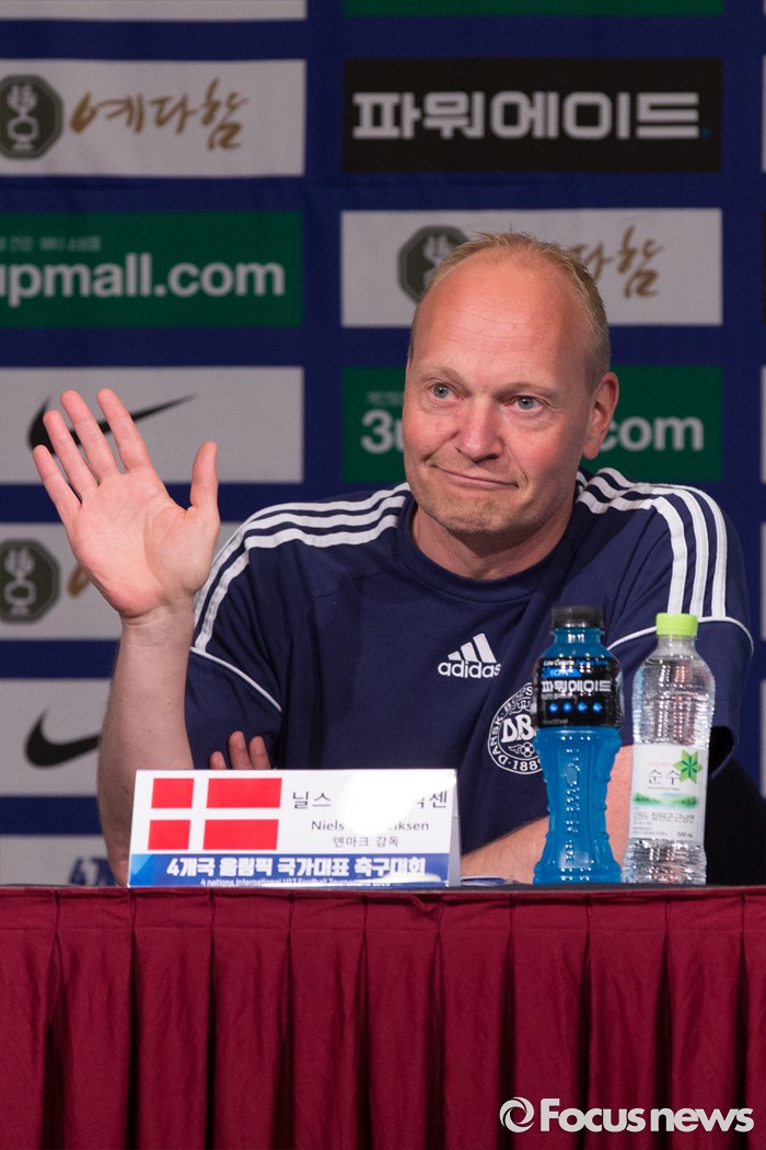 (인천=포커스뉴스) 1일 오전 인천 연수구 라마다송도호텔에서 열린 4개국 올림픽 국가대표 축구대회 공식 기자회견에 참가한 닐스 프레드닉센 덴마크 감독이 인사를 하고 있다.