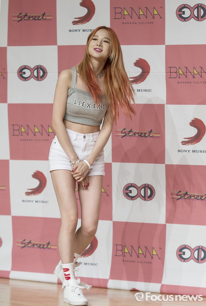 (서울=포커스뉴스) 1일 오전 서울 강남구 일지아트홀에서 열린 걸그룹 EXID의 정규 1집앨범 'STREET' 발표 쇼케이스에 참석한 멤버 솔지가 포토타임전 인사를 하고 있다.