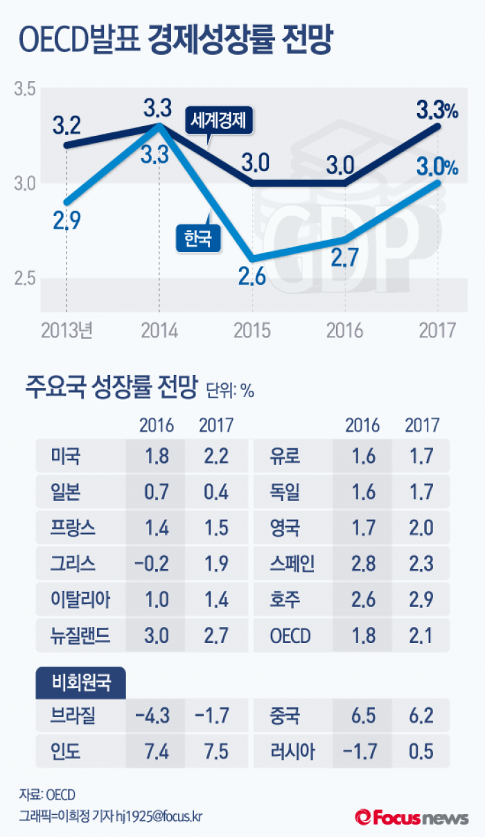 (서울=포커스뉴스) 1일 OECD가 공개한 ‘OECD경제전망(OECD Economic Outlook)’에 따르면 올해 한국경제 성장률은 2.7%, 2017년에는 3%를 전망한다고 밝혔다. 이는 지난 5월 16일 발표한 성장 전망치와 동일하다.