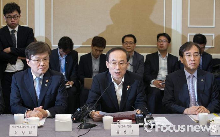 (서울=포커스뉴스) 2일 오전 서울 여의도 국회 귀빈식당에서 열린 미세먼지 대책 관련 당정협의에 참석한 윤성규 환경부 장관이 모두발언을 하고 있다. 왼쪽부터 최양희 미래창조과학부 장관, 윤 장관, 이석준 국무조정실장.