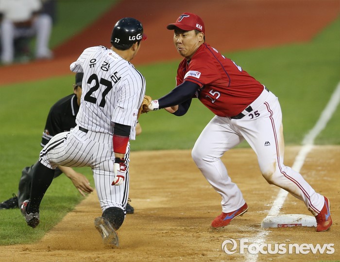 (서울=포커스뉴스) 1일 서울 잠실구장에서 열린 2016 프로야구 KIA-LG 경기 5회말 1사 3루에서 LG 박용택의 2루 땅볼때 3루주자 유강남이 귀루하다 KIA 3루수 이범호에게 태그아웃되고 있다.
