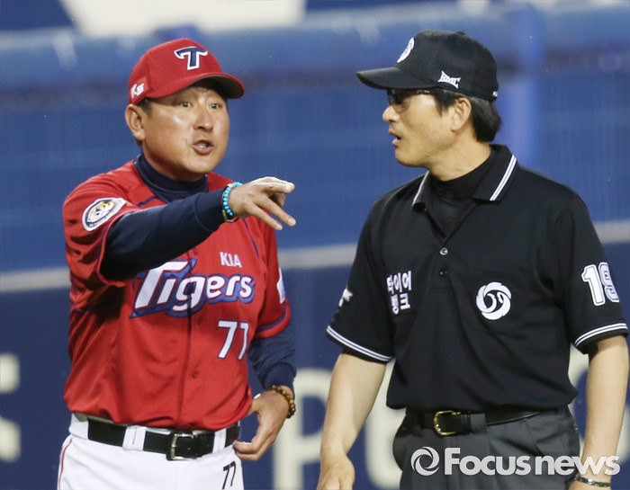 (서울=포커스뉴스) 1일 서울 잠실구장에서 열린 2016 프로야구 KIA-LG 경기 5회말 2사 1루에서 KIA 김기태 감독이 김광회 3루심에게 강하게 항의하고 있다.