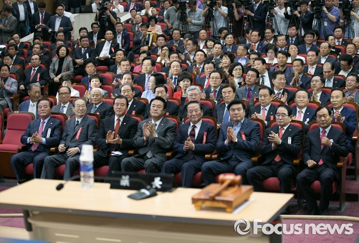 (서울=포커스뉴스) 2일 오후 서울 여의도 국회 의원회관에서 열린 새누리당 4차 전국위원회에 참석한 정진석 원내대표, 서청원 전 최고위원, 원유철 전 원내대표 등 전국위원들이 박수치고 있다.
