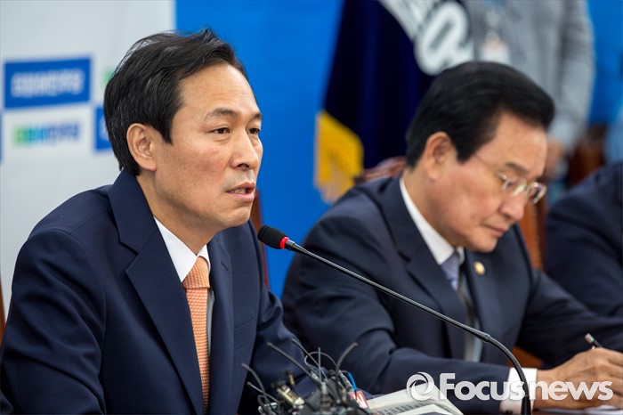 (서울=포커스뉴스) 우상호 더불어민주당 원내대표가 2일 오전 서울 여의도 국회에서 열린 정책조정회의에 참석해 모두발언 하고 있다.