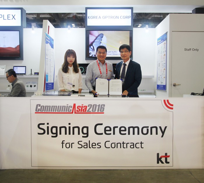 김영명 KT 창조경제추진단장은 “우수한 기술력을 보유한 협력사 및 육성기업이 글로벌시장에서 경쟁력을 갖출 수 있도록 앞으로도 기회를 더욱 확대하고 전폭 지원할 예정”이라고 말했다.커뮤닉아시아 KT 협력사 전시부스에서 정석근 고려오트론 회장(오른쪽)과 벤자민 옹 매스트론 CEO(가운데)가 25억원 납품계약을 체결한 후 기념사진을 촬영하고 있다.<사진제공=KT>