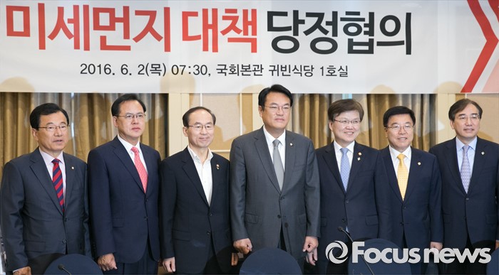 (서울=포커스뉴스) 2일 오전 서울 여의도 국회 귀빈식당에서 열린 미세먼지 대책 관련 당정협의에 참석한 의원들과 장, 차관들이 취재진을 향해 포즈를 취하고 있다. 왼쪽부터 이현재, 이명수 의원, 윤성규 환경부 장관, 정진석 원내대표, 최양희 미래창조과학부 장관, 김광림 정책위의장, 이석준 국무조정실장.