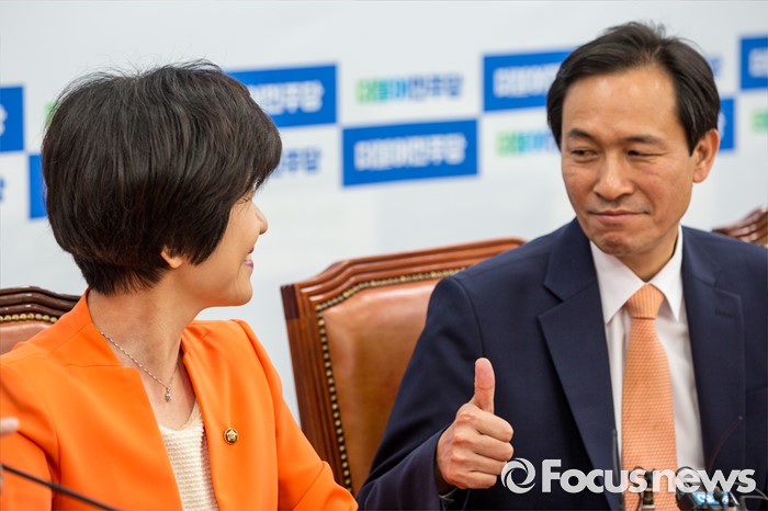 (서울=포커스뉴스) 우상호(오른쪽) 더불어민주당 원내대표가 2일 오전 서울 여의도 국회에서 열린 '가계부채 TF 발족식'에 참석해 김영주 가계부채TF 단장이 모두발언을 마치자 엄지 손가락을 들어보이고 있다.