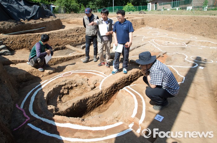 (충주=포커스뉴스) 충북 충주 칠금동 392-5번지 일대에서 백제 제철유적이 발견된 가운데 2일 현장에서 발굴조사 현장설명회가 열렸다. 학계관계자들이 제철유적을 살피고 있다.