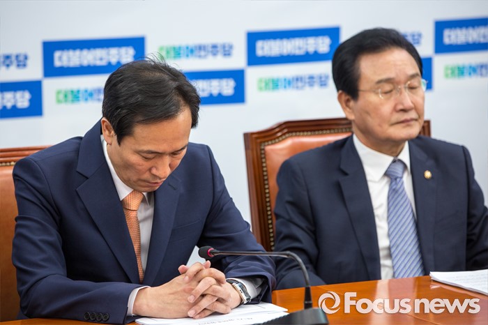 (서울=포커스뉴스) 우상호(왼쪽) 더불어민주당 원내대표와 변재일 정책위의장이 2일 오전 서울 여의도 국회에서 열린 정책조정회의에 참석하고 있다.