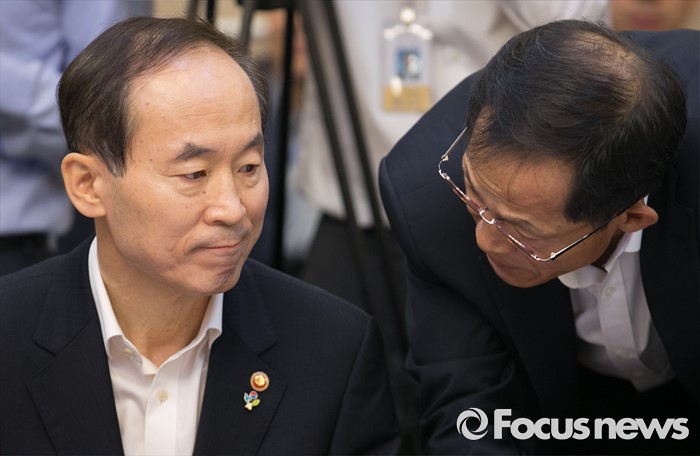 (서울=포커스뉴스) 2일 오전 서울 여의도 국회 귀빈식당에서 열린 미세먼지 대책 관련 당정협의에 참석한 윤성규(왼쪽) 환경부 장관이 관계자와 대화하고 있다.