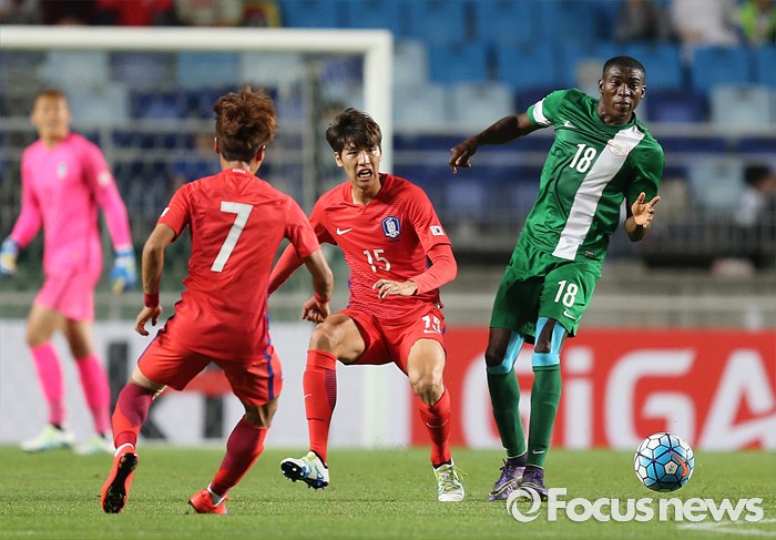 (수원=포커스뉴스) 2일 오후 경기 수원월드컵경기장에서 열린 2016 4개국 올림픽국가대표 축구대회 대한민국과 나이지리아의 경기에서 대한민국 최규백이 패스하고 있다.
