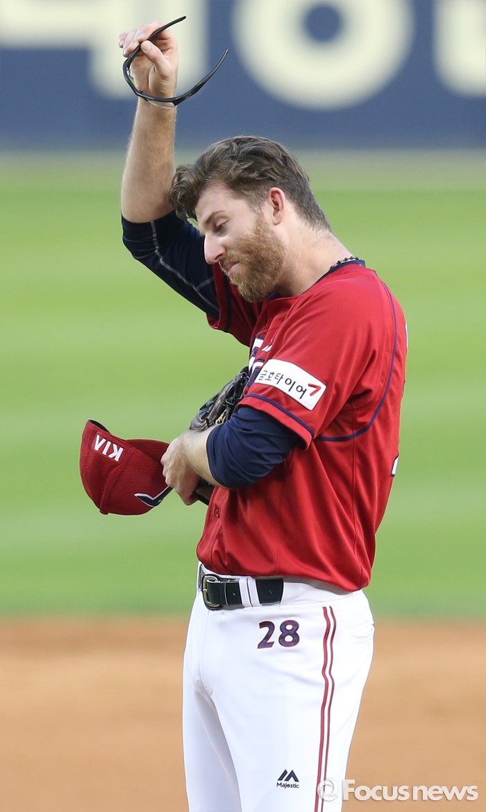 (서울=포커스뉴스) 2일 서울 잠실구장에서 열린 2016 프로야구 KIA-LG 경기에서 KIA 투수 지크가 3회말 수비중 이마의 땀을 닦고 있다.