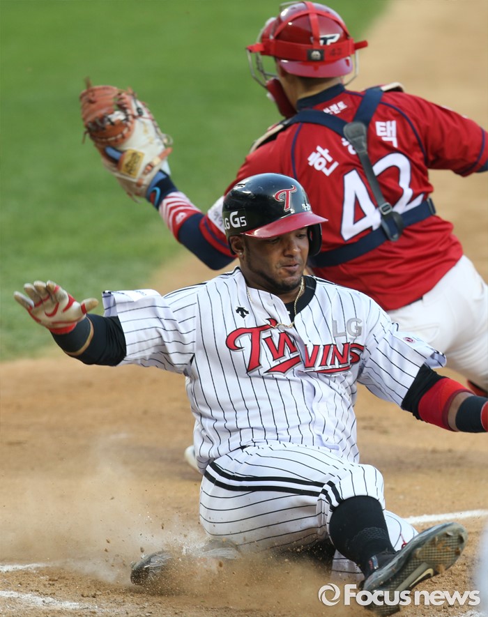 (서울=포커스뉴스) 2일 서울 잠실구장에서 열린 2016 프로야구 KIA-LG 경기 3회말 1사 2,3루에서 LG 채은성의 좌전 적시타때 2루주자 히메네스가 슬라이딩하며 홈인하고 있다.