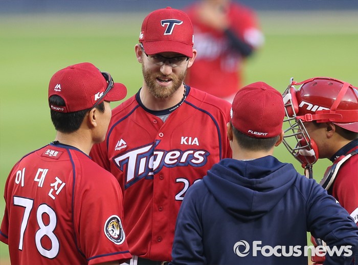 (서울=포커스뉴스) 2일 서울 잠실구장에서 열린 2016 프로야구 KIA-LG 경기 3회말 KIA 투수 지크가 실점하자 이대진 투수 코치가 마운드에 올라가 진정시키고 있다.