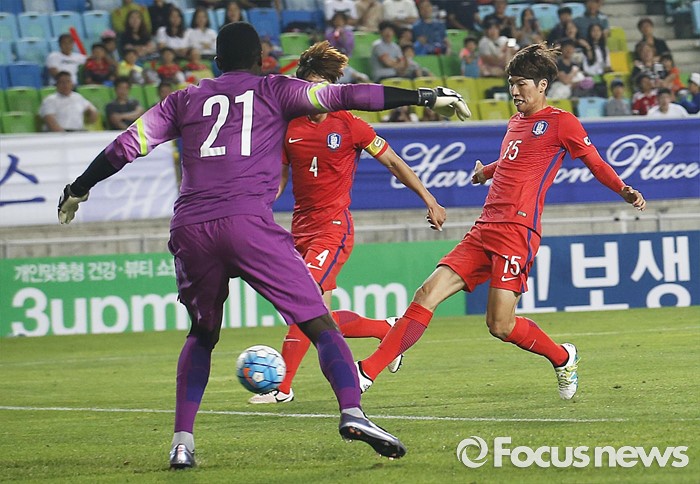 (수원=포커스뉴스) 2일 오후 경기 수원월드컵경기장에서 열린 2016 4개국 올림픽국가대표 축구대회 대한민국과 나이지리아의 경기에서 대한민국 최규백이 후반전 선제골을 성공시키고 있다.