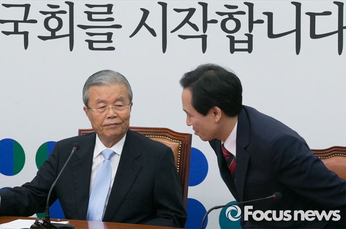 (서울=포커스뉴스) 3일 오전 서울 여의도 국회에서 더불어민주당 비상대책위원회의를 마친 뒤 김종인(왼쪽) 비대위 대표와 우상호 원내대표가 대화하고 있다.