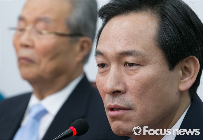 (서울=포커스뉴스) 3일 오전 서울 여의도 국회에서 열린 더불어민주당 비상대책위원회의에 참석한 우상호 원내대표가 발언을 하고 있다. 왼쪽은 김종인 비대위 대표.