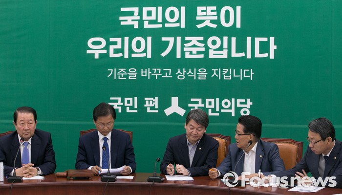 (서울=포커스뉴스) 3일 오전 서울 여의도 국회에서 열린 국민의당 최고위원회의에 참석한 안철수(왼쪽 세번째) 상임공동대표와 박지원(오른쪽 두번째) 원내대표가 대화하고 있다.