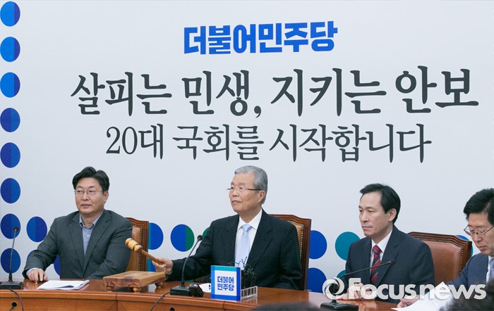 (서울=포커스뉴스) 3일 오전 서울 여의도 국회에서 열린 더불어민주당 비상대책위원회의에 참석한 김종인 비대위 대표가 개의 선언을 하고 있다.