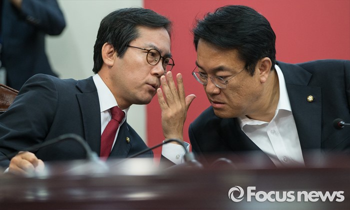 | △ 귀엣말하는 정진석과 김영우 |