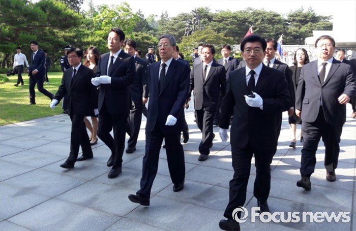 (서울=포커스뉴스) 김희옥 새누리당 혁신비대위원장과 정진석 원내대표 등이 3일 오전 동작구 국립서울현충원을 방문해 참배를 위해 이동하고 있다.