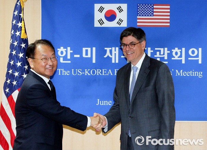(서울=포커스뉴스) 3일 오후 종로구 정부서울청사에서 열린 한·미 재무장관회의에 참석한 유일호(왼쪽) 경제부총리 겸 기획재정부 장관과 제이콥 루(Jacob Lew) 미국 재무부 장관이 취재진을 향해 포즈를 취하고 있다.