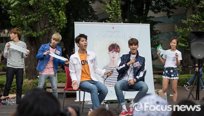 (서울=포커스뉴스) 3일 오후 서울 광진구 건대입구 스타시티 광장에서 가수 송유빈(왼쪽 세번째)이 거리공연을 하고 있다.