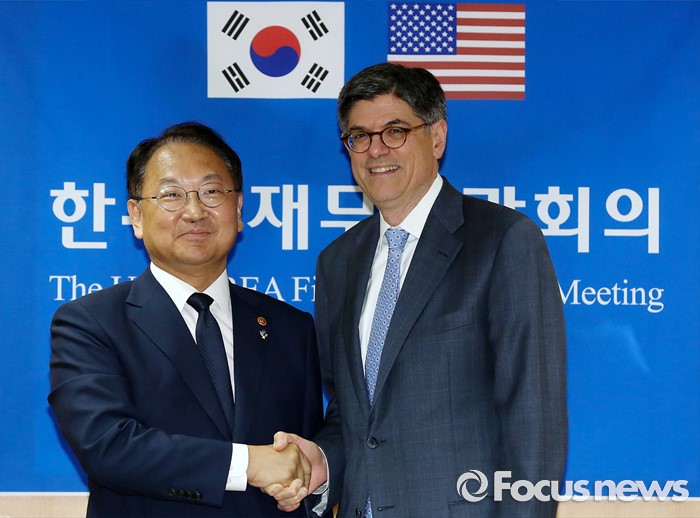(서울=포커스뉴스) 3일 오후 종로구 정부서울청사에서 열린 한·미 재무장관회의에 참석한 유일호(왼쪽) 경제부총리 겸 기획재정부 장관과 제이콥 루(Jacob Lew) 미국 재무부 장관이 악수하고 있다.